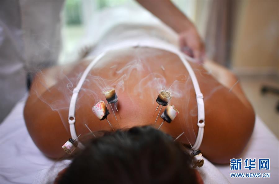 俄羅斯游客維多利亞·米哈拉普在三亞國際友好中醫療養院進行中醫理療(2018年6月2日攝)。新華社記者郭程攝