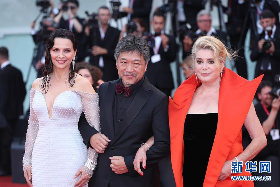 8月28日,在意大利威尼斯,開(kāi)幕影片《真相》導(dǎo)演是枝裕和(中)攜主演朱麗葉·比諾什(左)與凱瑟琳·德納芙亮相開(kāi)幕式紅毯。新華社記者 程婷婷 攝