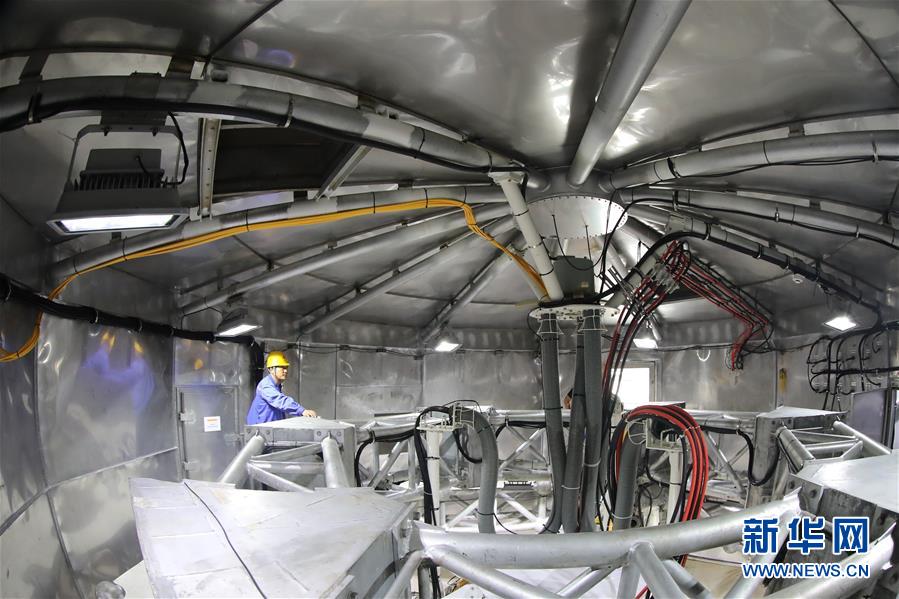 8月28日,工作人員在FAST饋源艙內進行檢修。 新華社記者 歐東衢 攝