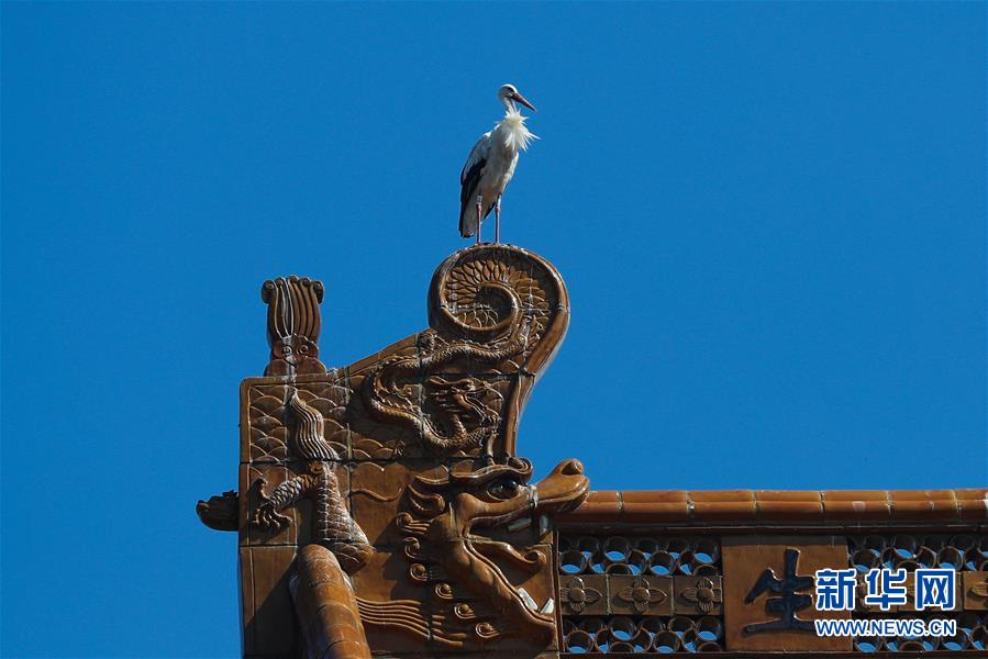 8月24日,在比利時布呂熱萊特市,一只白鸛站在天堂動物園“中國園”的建筑上。新華社記者 鄭煥松 攝