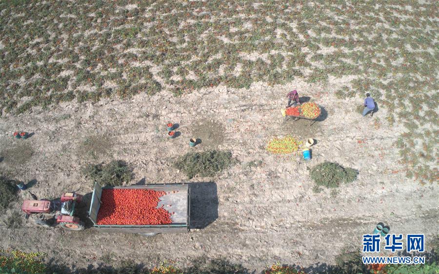 9月4日無人機拍攝的河套灌區友愛村四組村民仇漢強夫婦在收獲番茄。 新華社記者 劉詩平 攝