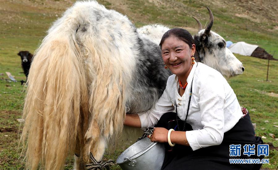 在青海省玉樹藏族自治州治多縣治渠鄉同卡村,村民昂文西讓的妻子布沙措江卓瑪正在擠牛奶(9月12日攝)。新華社記者 韓方方 攝