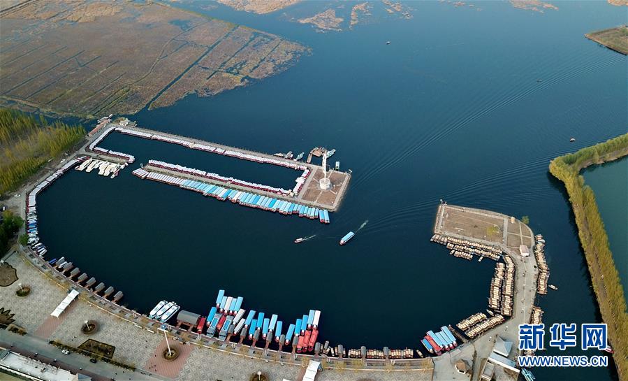 游船在白洋淀旅游碼頭內行駛(4月10日無人機拍攝)。新華社記者牟宇攝