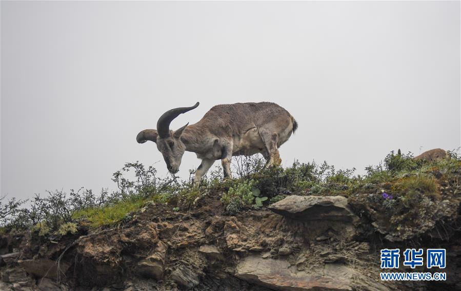 一只巖羊在西藏山南市洛扎縣色鄉海拔4000米左右的盤山路邊,悠閑地吃著野果青草(9月22日攝)。 新華社記者 晉美多吉 攝