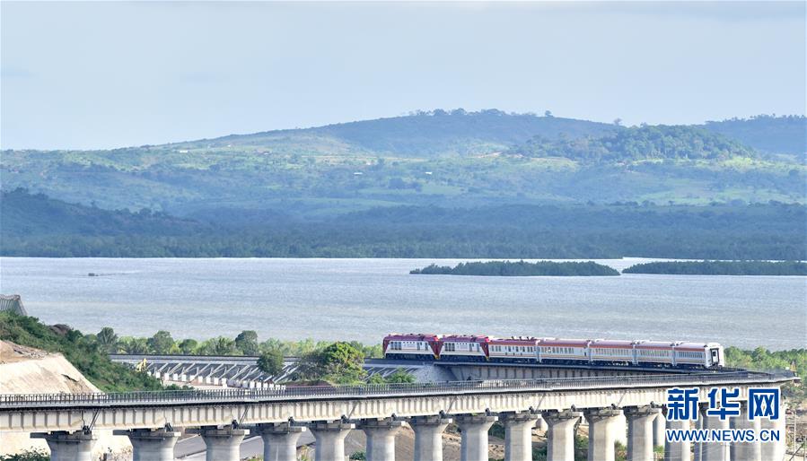 2017年5月29日,一列肯尼亞蒙內鐵路測試列車行駛在蒙巴薩特大橋上。由中國承建的蒙巴薩-內羅畢標軌鐵路(蒙內鐵路)全長約480公里,于2017年5月通車。新華社記者孫瑞博攝