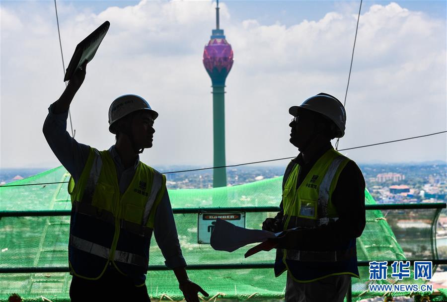 2019年4月9日,在斯里蘭卡科倫坡,中方項目經理楊子江(左)與項目副經理Thuwan在工地討論工作進度,他們背后是科倫坡地標建筑蓮花塔。Thuwan是中國中建裝飾集團深圳裝飾公司斯里蘭卡濱江度假村項目的副經理。在中方管理人員手把手的指導下,Thuwan從最初的一名普通商務員變成了一位優秀的屬地化管理人員,成為了中斯雙方人員溝通的橋梁。新華社記者劉大偉攝