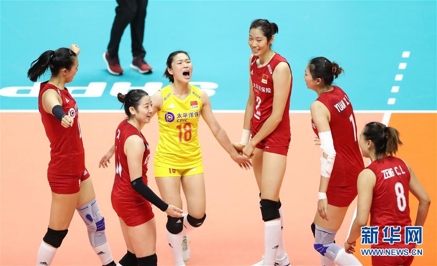 9月22日,中國隊球員在比賽中慶祝得分。當日,在日本札幌舉行的2019年女排世界杯賽第二階段A組循環賽中,中國隊以3比2戰勝巴西隊。新華社記者杜瀟逸攝