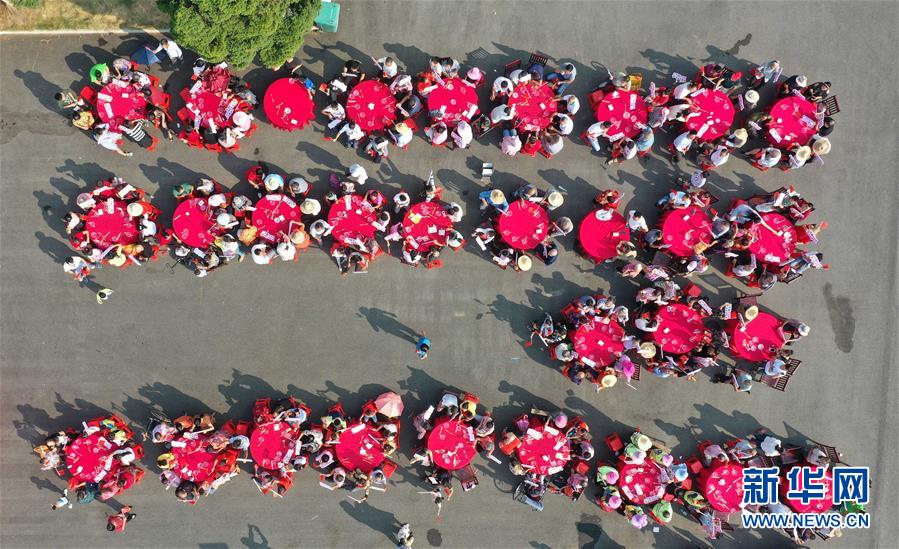 10月1日,在江西省南昌市南昌縣銀三角敷林村,當地村民舉行“同吃國慶面 共迎國慶節”活動(無人機拍攝)。當日是國慶節,全國各地的人們用各種方式歡度節日。新華社記者 彭昭之 攝