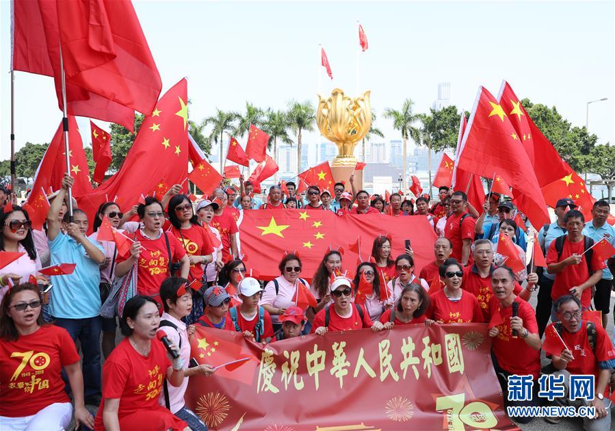 10月1日,香港市民在金紫荊廣場高唱愛國歌曲。當日是國慶節,全國各地的人們用各種方式歡度節日。新華社記者 吳曉初 攝