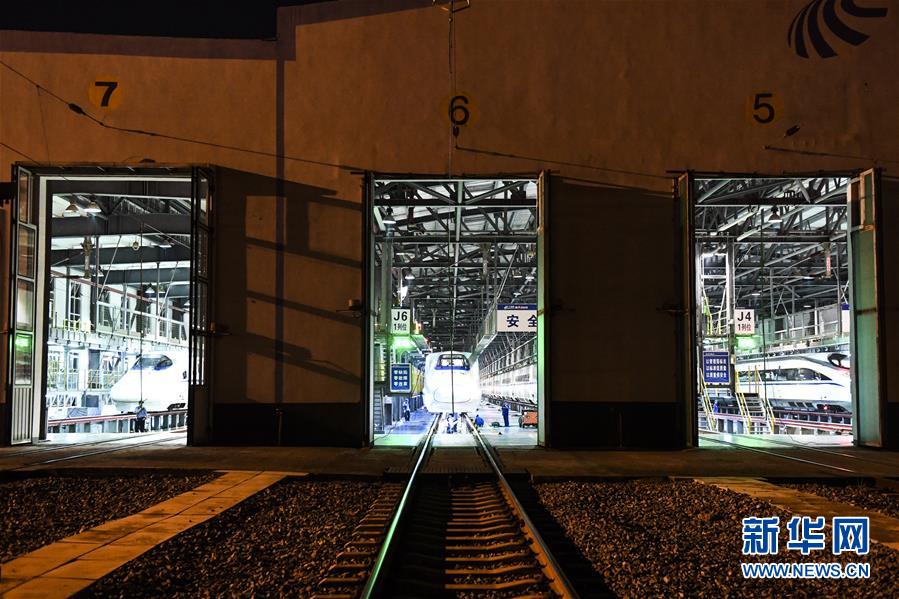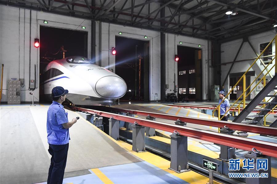 “動車醫生”在進行動車組放電作業(10月2日攝)。 新華社記者 曹祎銘 攝