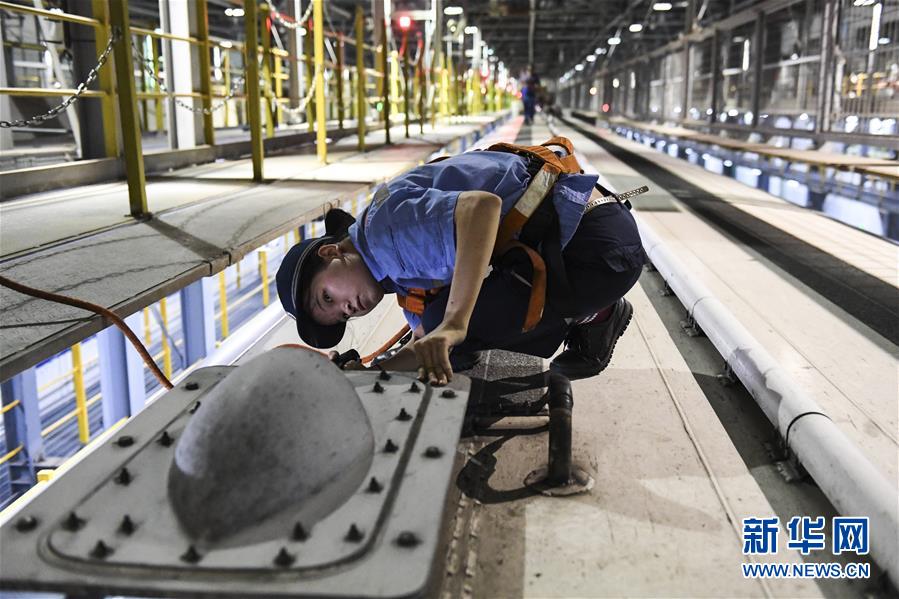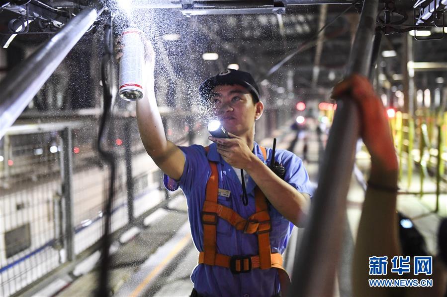 工人在擦洗車頂絕緣子(10月2日攝)。 新華社記者 曹祎銘 攝