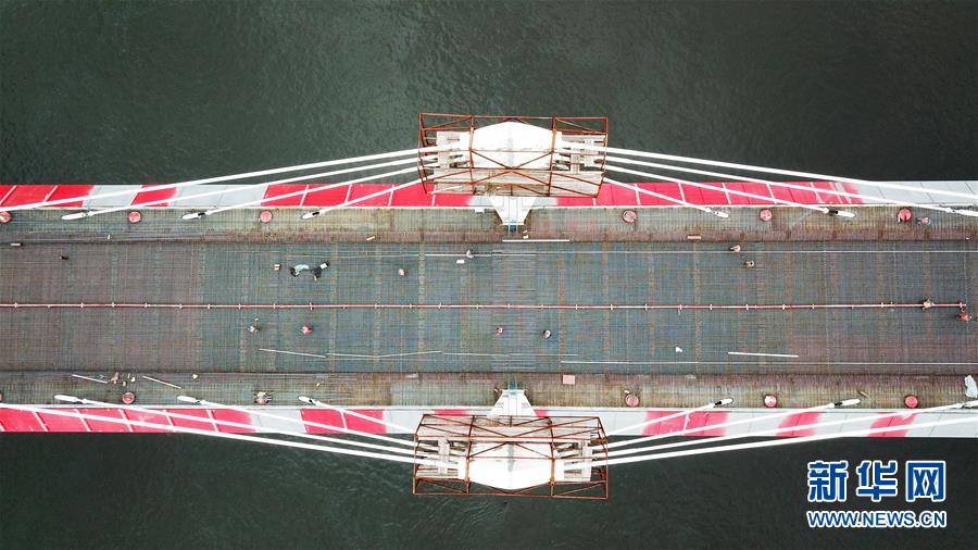 正在進行橋面鋪裝施工作業的黑河到布拉戈維申斯克黑龍江(阿穆爾河)大橋(8月19日無人機拍攝)。新華社記者 王建威 攝