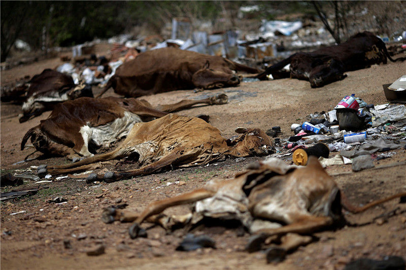 當地時間2017年2月12日,巴西帕拉伊巴,路上躺著牛的尸體。