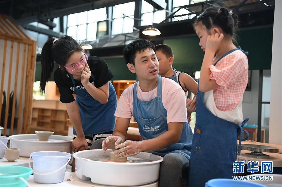 在江西景德鎮陶溪川文創街區的陶公塾實訓基地,孩子們在老師(中)的指導下制作陶藝作品(7月26日攝)。新華社記者 萬象 攝