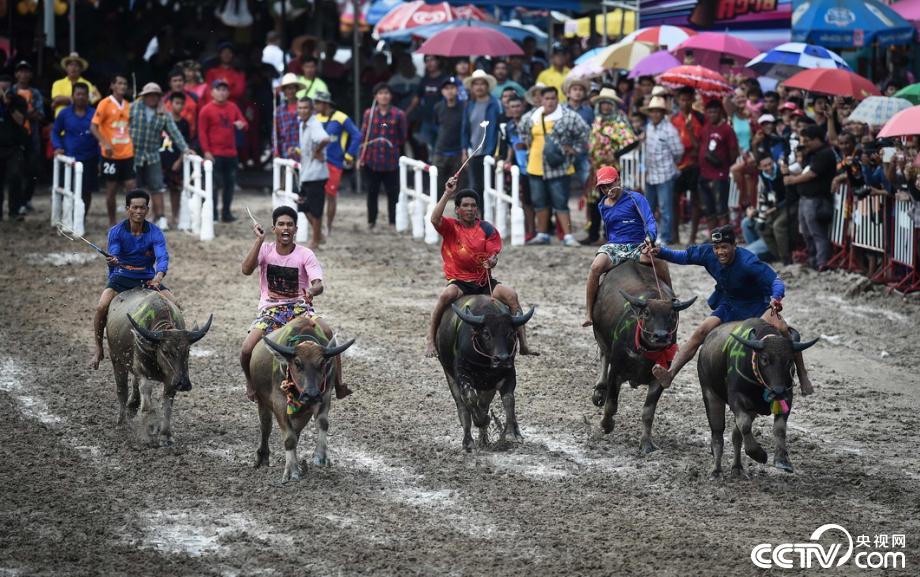 央視網消息:當地時間2019年10月12日,泰國春武里舉行一年一度的水牛賽跑,選手騎牛狂奔。視覺中國