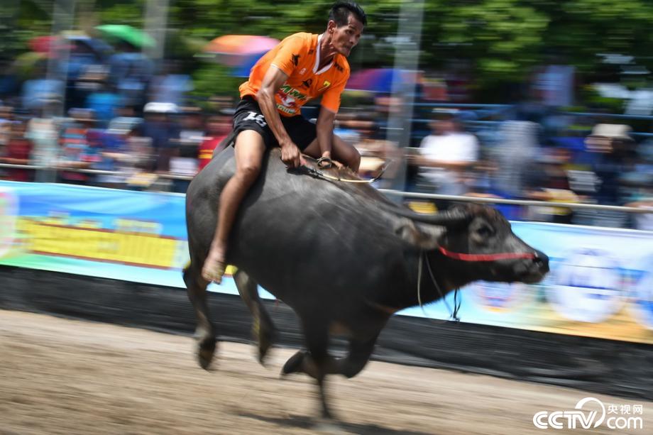 當地時間2019年10月12日,泰國春武里舉行一年一度的水牛賽跑,選手騎牛狂奔。視覺中國