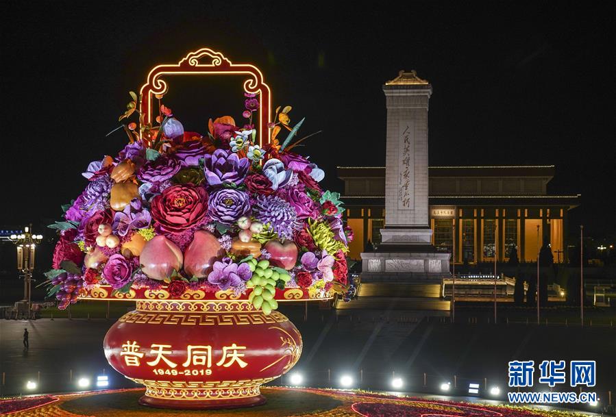 這是10月14日拍攝的天安門廣場中心花壇。 10月14日,以“花果籃”為主造型的天安門廣場中心花壇吸引了眾多游客參觀拍照。“花果籃”的夜景更是流光溢彩,絢爛迷人。 新華社記者 殷剛 攝