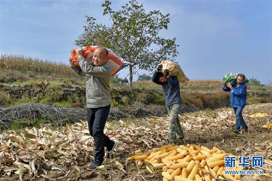 在奪火鄉高谷堆村,第一書記侯俊國(左)在幫助村民收玉米(10月13日攝)。 新華社記者 曹陽 攝