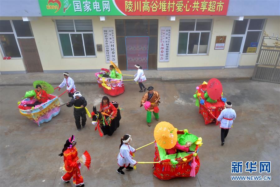 今年秋天,高谷堆村又迎來豐收,村民排練起當地傳統民俗節目“推小車”,準備在縣里舉辦的文藝匯演上好好展示一下脫貧后的精氣神兒。 新華社記者 曹陽 攝