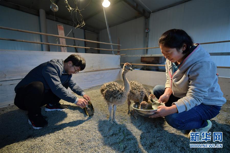 村民許俊鵬和妻子在照料小鴕鳥(10月14日攝)。2017年初,高谷堆村貧困戶許俊鵬一家在扶貧干部的幫助下開始嘗試養殖鴕鳥創收。目前,許俊鵬一家已建成擁有20余只鴕鳥的養殖基地,平均年收入近4萬元。 新華社記者 曹陽 攝
