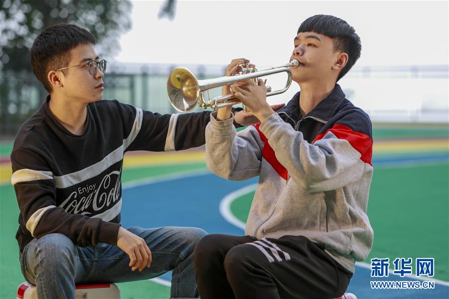 王太樊在教室外的樓道給自己心愛的小號試音(10月10日攝)。 新華社記者 劉潺 攝