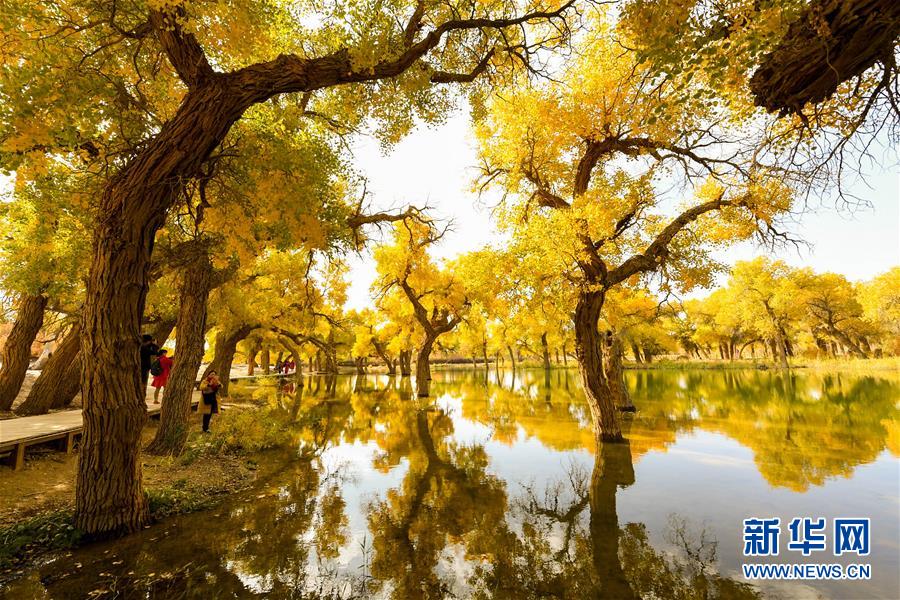 10月16日,這是內蒙古阿拉善盟額濟納旗境內的胡楊林。金秋時節,位于內蒙古阿拉善盟額濟納旗境內的胡楊林披上了金黃色的外衣,在陽光的照射下呈現絢麗奪目的色彩,成為沙漠深處的一抹亮色。新華社記者彭源攝