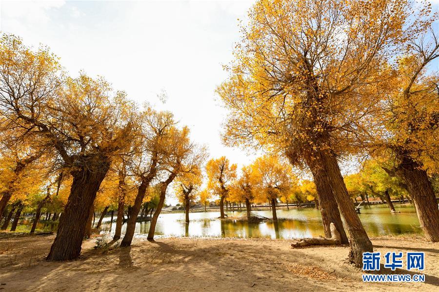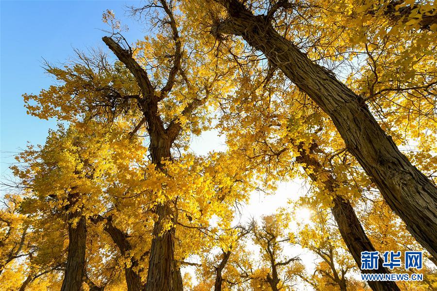 大片的胡楊樹葉由綠變黃,一眼望去,陽光下金色的樹葉襯著湛藍的天空于風中婆娑起舞。
