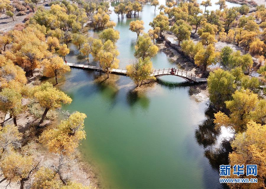 10月16日無人機拍攝的內蒙古阿拉善盟額濟納旗境內的胡楊林。新華社記者彭源攝