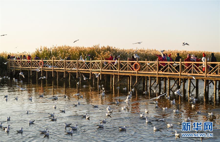 10月17日,游客在居延海岸邊的木棧道上觀賞水鳥。新華社記者 彭源 攝