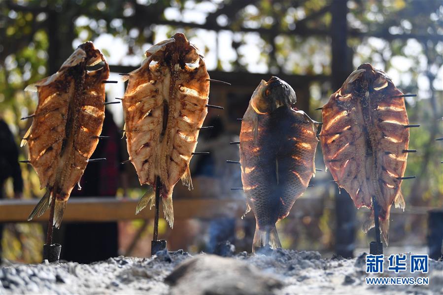 10月26日在新疆阿瓦提縣刀郎部落景區拍攝的烤魚。新華社記者沙達提攝