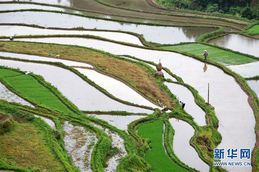 5月18日,農民在貴州省丹寨縣龍泉鎮高要梯田里勞作。初夏時節,位于貴州省丹寨縣龍泉鎮的高要梯田景色優美。新華社記者楊文斌攝