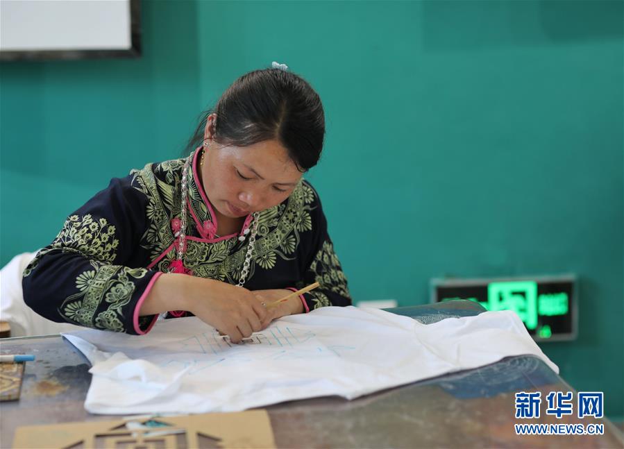 7月2日,苗族婦女王尖其在丹寨萬達小鎮展示苗族蠟染技藝。新華社記者歐東衢攝