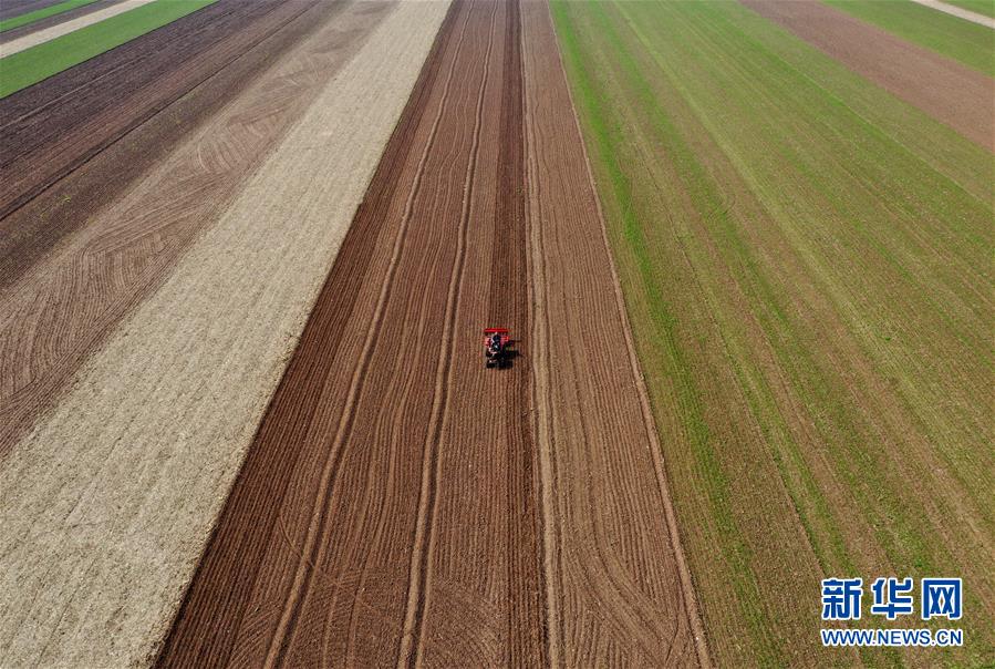 河南省寶豐縣肖旗鄉(xiāng)解莊村農(nóng)民駕駛機(jī)械在農(nóng)田里搶種冬小麥(10月17日無(wú)人機(jī)拍攝)。新華社記者李嘉南攝