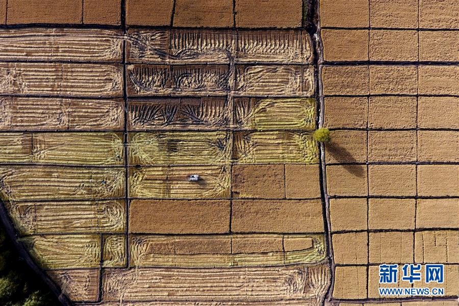 在太原市晉源區赤橋村,收割機在稻田里作業(10月28日無人機拍攝)。新華社記者詹彥攝