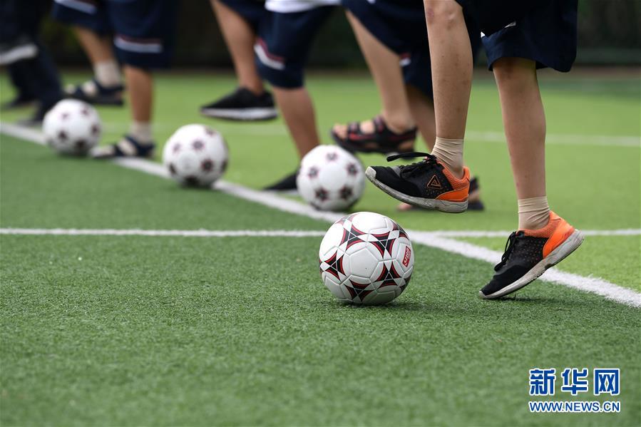 9月3日,金寨縣希望小學學生在足球課上訓練。新華社記者張端攝