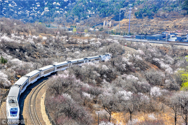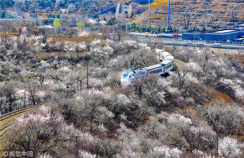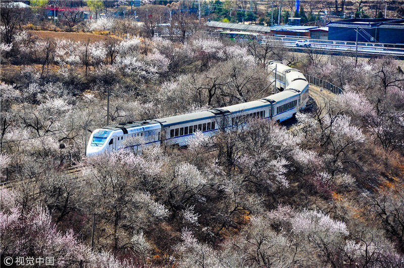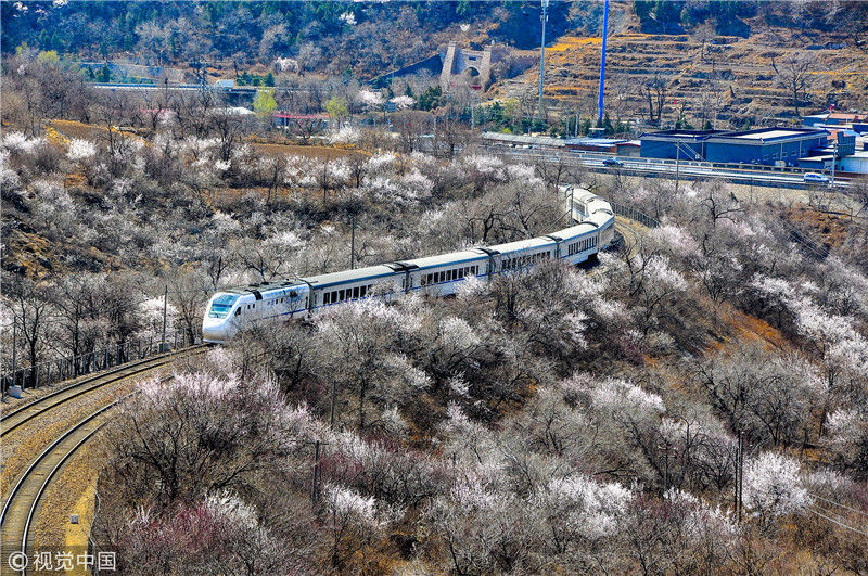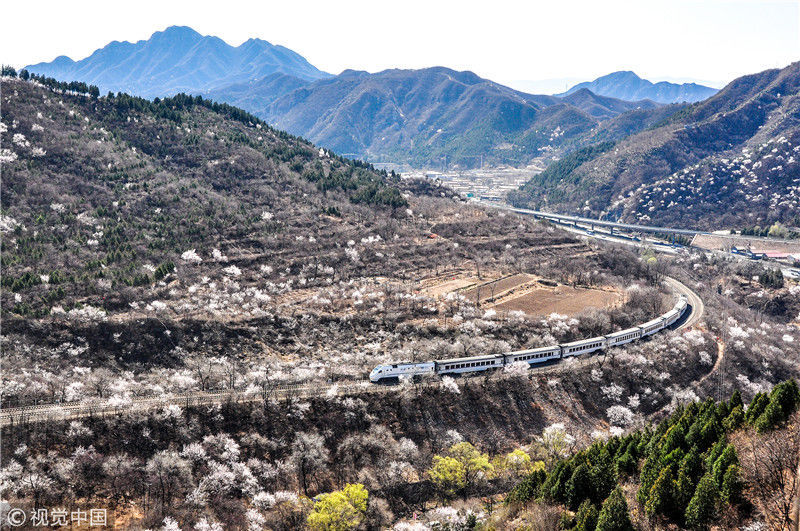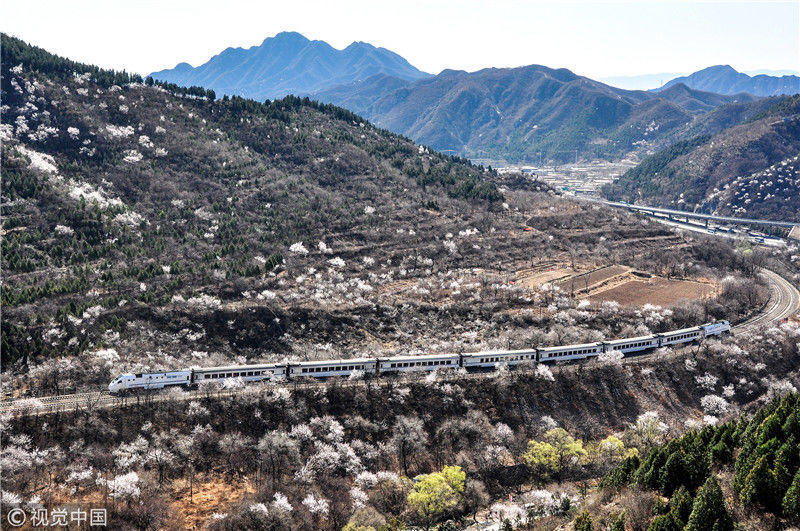 2019年3月22日,北京居庸關(guān)附近的山花盛開(kāi),S2線列車穿行在花海之中,構(gòu)成一幅美麗的畫面。時(shí)永平/千龍圖像/視覺(jué)中國(guó)編輯/陳進(jìn)