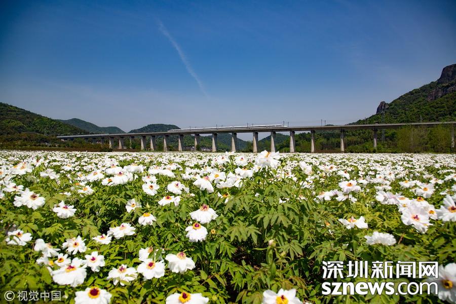 2019年4月8日,一列高鐵列車從京福高鐵安徽銅陵段一片盛開(kāi)的鳳丹花海中駛過(guò)。