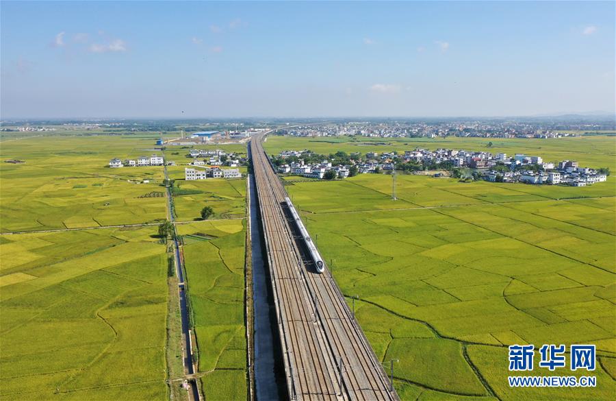 10月29日,列車從廣西賓陽(yáng)縣古辣鎮(zhèn)豐收的稻田間駛過(guò)(無(wú)人機(jī)拍攝)。新華社記者陸波岸攝