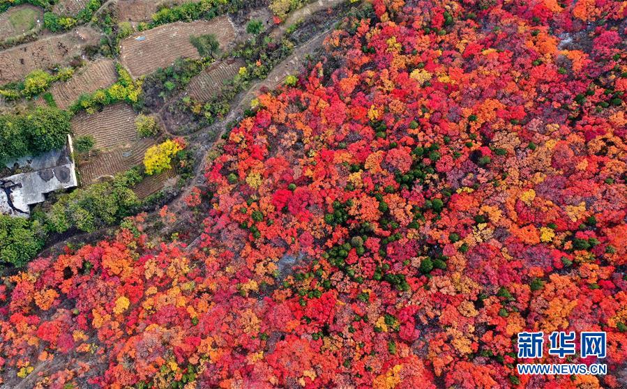 濟南蝎子山上火紅的黃櫨樹林(11月4日無人機拍攝)。 新華社記者 朱崢 攝