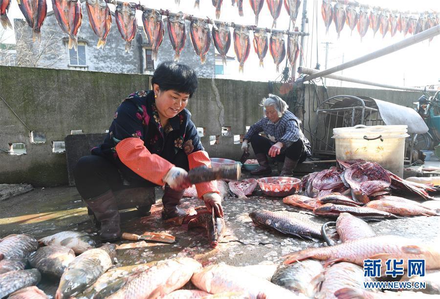 3月12日,浙江省湖州市吳興高新區幻溇村村民在剖魚準備腌制魚干。近日,太湖南岸湖州地區久雨初晴,漁民忙著制作、晾曬魚干。新華社記者翁忻旸攝