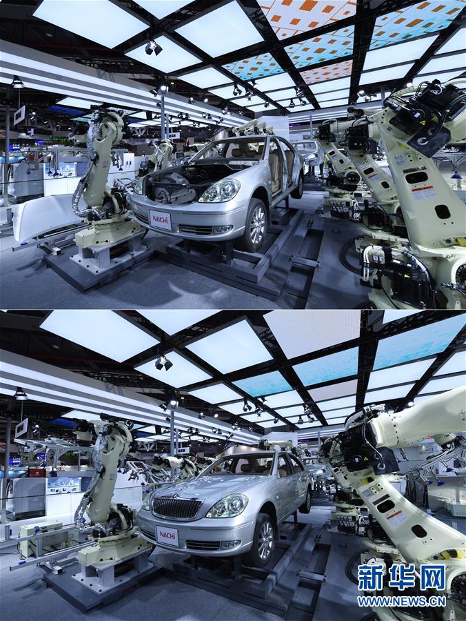 11月5日在第二屆進博會裝備展區日本那智不二越公司展臺拍攝的拼版照片。上圖是NACHI超高速點焊SRA系列機器人操作前的汽車骨架;下圖為間隔一分鐘后拍攝的NACHI超高速點焊SRA系列機器人操作后的汽車外殼。新華社記者范培珅攝