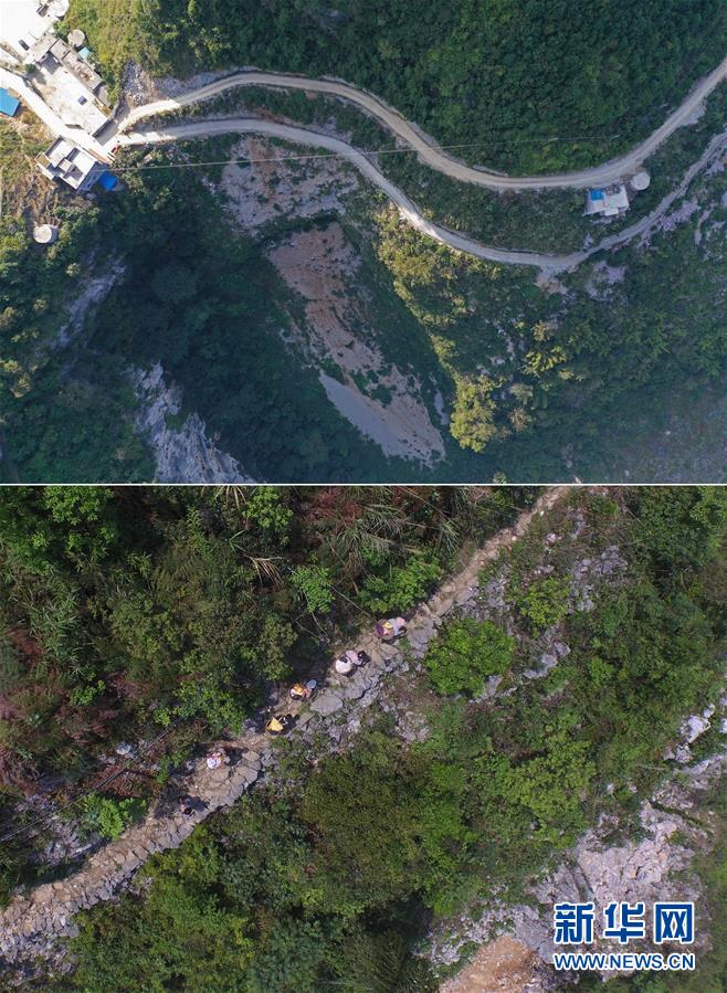 拼版照片:上圖為已經修通水泥路的大化瑤族自治縣板升鄉八好村八好屯(11月11日無人機拍攝);下圖為在尚未通路的八好村八好屯,村民背著化肥走山路回家(2016年4月15日攝)。新華社記者 黃孝邦 攝