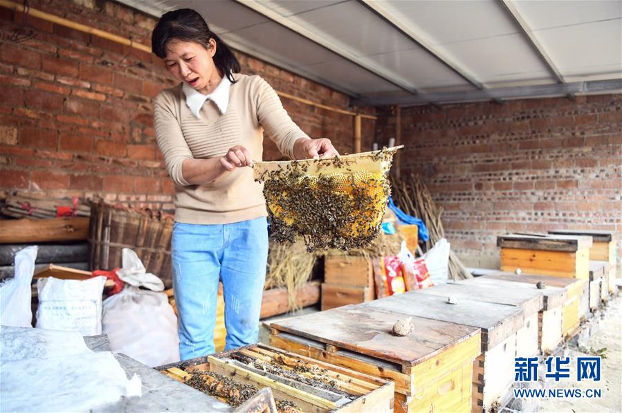 這是葉德華在查看蜂蜜成色,準備送檢(11月12日攝)。 葉德華是廣西陽朔縣楊堤鄉楊堤村村民,一家人的生計由她一人撐起,母親年邁,兒子年幼,家庭經濟困難。 2017年起,葉德華在當地扶貧干部和養蜂協會的幫扶下開始發展蜜蜂特色養殖,從養殖8箱蜜蜂起步走上養蜂脫貧致富路。目前她的蜂蜜產品遠銷上海、深圳、湖南等地,年收入近10萬元,不僅脫貧摘帽,還建起了兩層小樓。 目前,葉德華在努力學習電商銷售的同時,還積極向貧困戶傳授養蜂技能,爭取幫助更多人走上脫貧致富路。 新華社記者張愛林攝