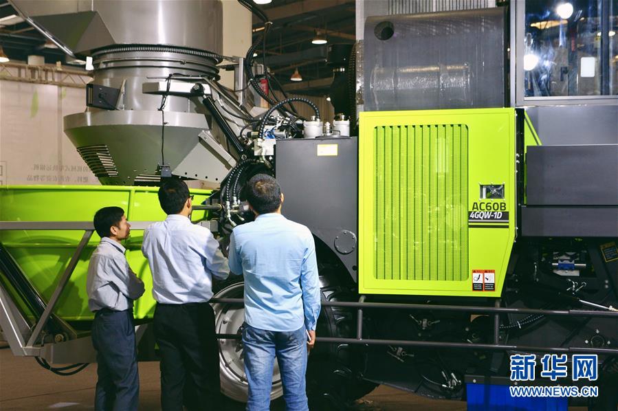 11月16日,參觀者在展會現場參觀甘蔗收割機械設備。