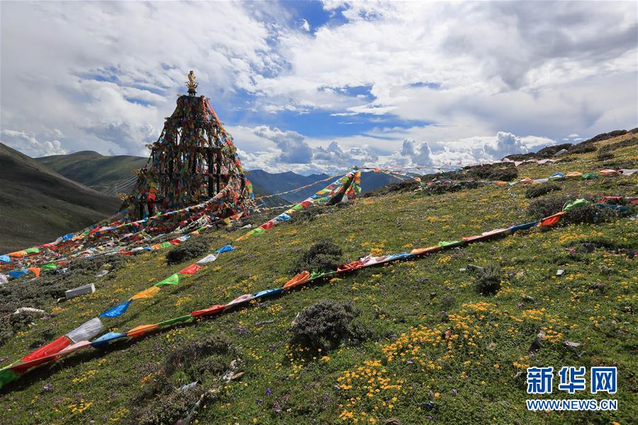 在川藏公路四川折多山埡口,藍天白云與經幡、草地、鮮花構成一幅美麗畫卷(6月28日攝)。新華社記者江宏景攝