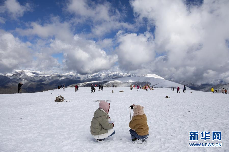 在318國道四川卡子拉山埡口,游人在雪地里留影、嬉戲(10月17日攝)。新華社記者江宏景攝
