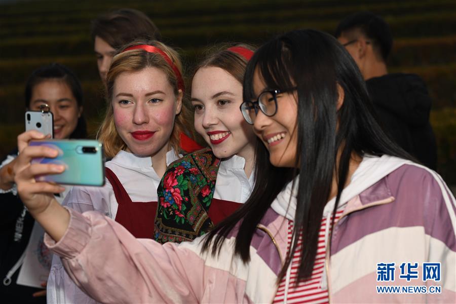 11月17日,來自俄羅斯的留學生在國際文化節上與觀眾合影。新華社記者 張端 攝