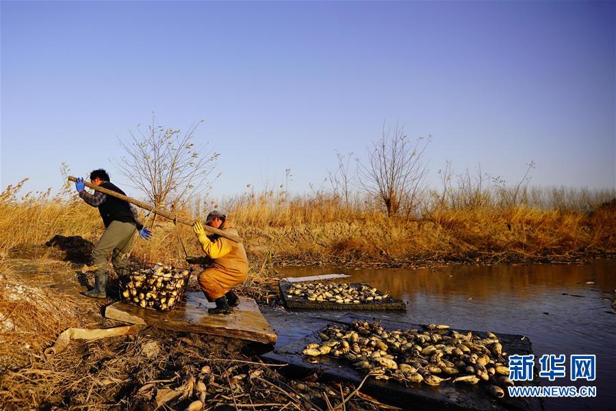 11月18日,工人在采收蓮藕。初冬時節,河北省唐山市曹妃甸蓮藕豐收,工人們在結冰之前忙著采收蓮藕。新華社記者楊世堯攝