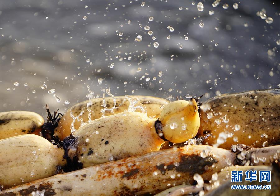11月18日拍攝的蓮藕。初冬時節,河北省唐山市曹妃甸蓮藕豐收,工人們在結冰之前忙著采收蓮藕。新華社記者邢廣利攝