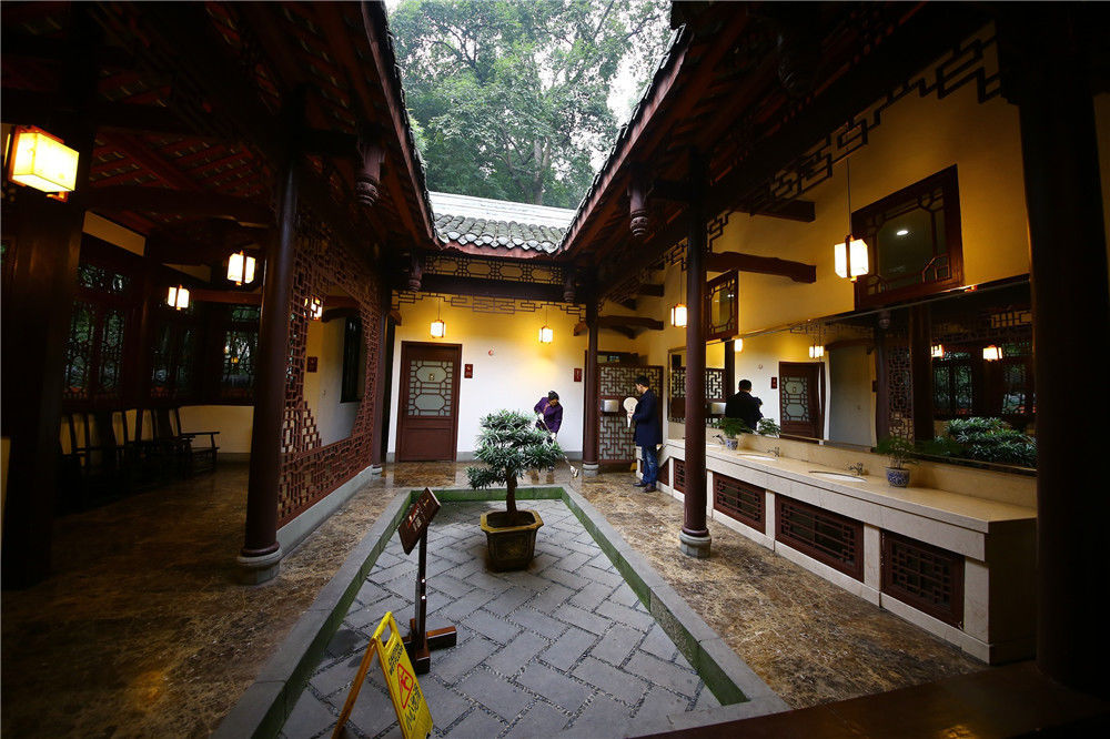 2017年01月03日,四川成都,在成都杜甫草堂景區,現古建筑風格式廁所。據悉,廁所內部設有母嬰室、飲水設備、公共電話、行李寄存柜,采用古建筑風格,為清一色的川西特色四合院。CYBS/視覺中國
